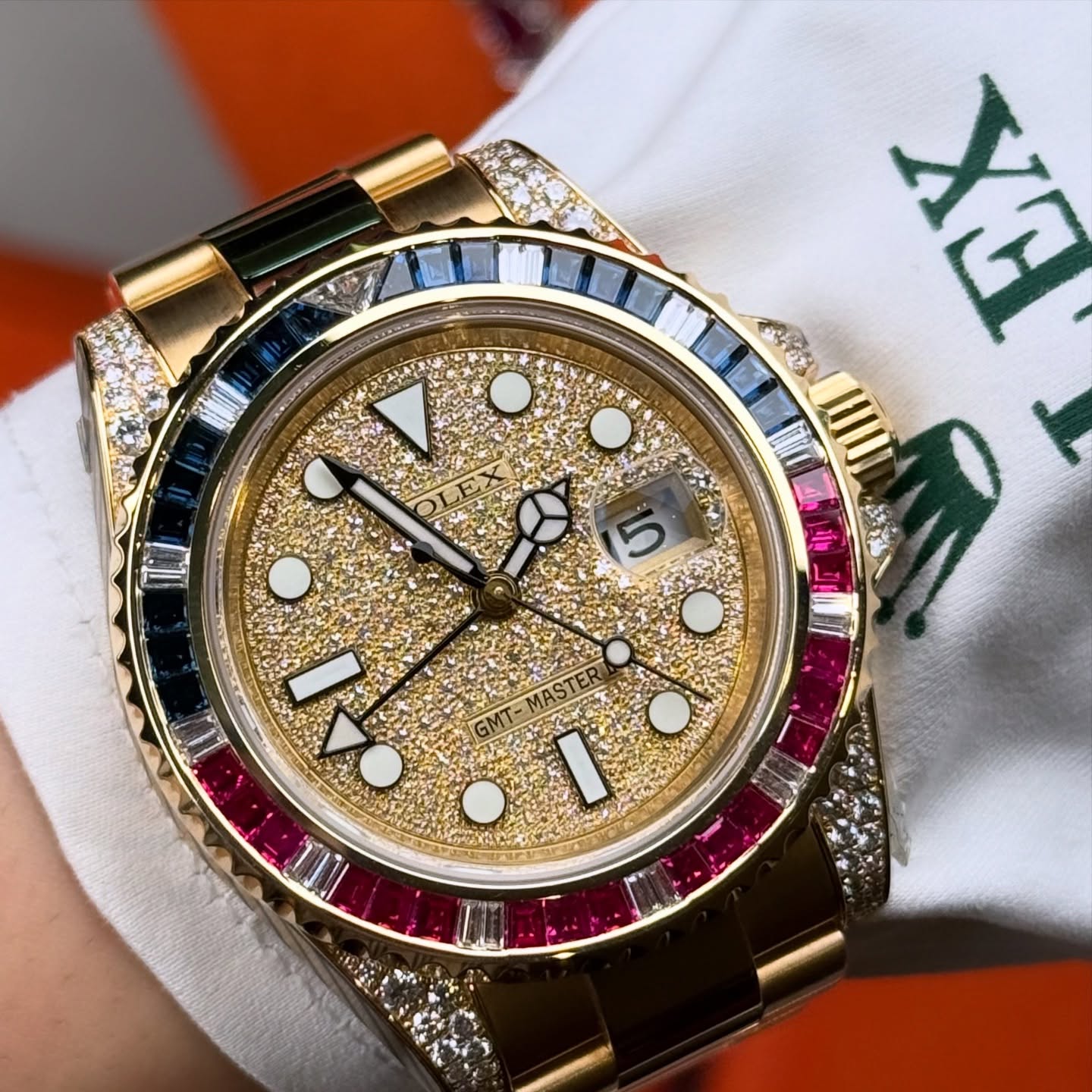 [·Î·º½º] ÃֽŹöÀü ¾÷±×·¹ÀÌµå º£½ºÆ®¼¿¸µ Áö¿¥Æ¼ ¸¶½ºÅÍII ¹Ù°ÔÆ® "½ºÄù¾î ´ÙÀÌ¾Æ¸ó º£Á©" °í±Þ½º·¯¿î 18K ¿»·Î¿ì°ñµå ¿ÀÅä¸Åƽ ¹«ºê¸ÕÆ® º¸¼®´ÙÀ̾ó rol0747 - Rolex GMT-Master 2 Oyster Diamonds Case Ruby & Sapphire Bezel 18K YellowGold Case Bracelet Automatic Movement Diamond Dial